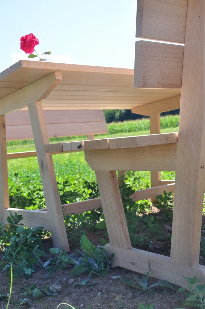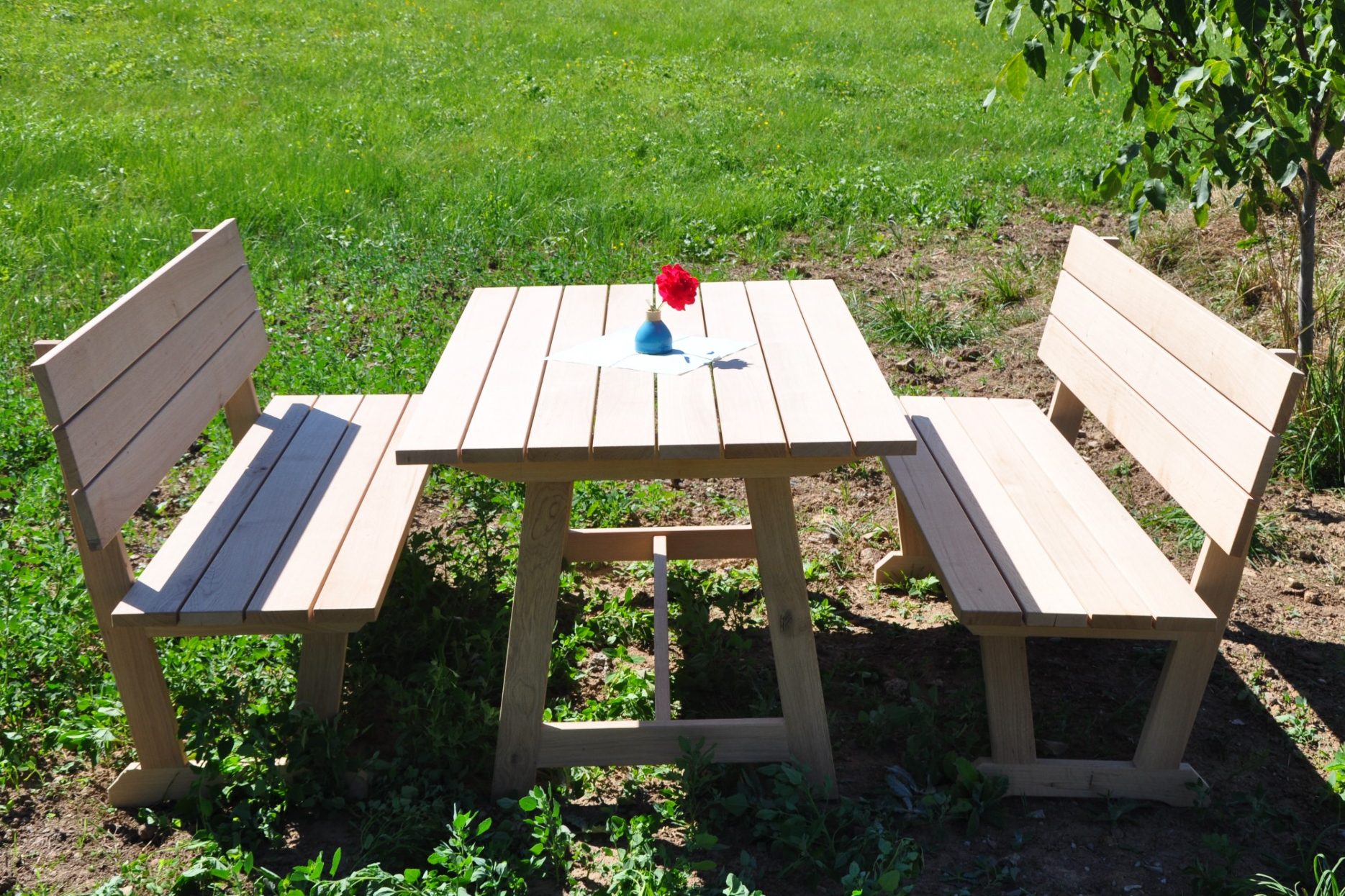 Gesellig genießen - robuste Garnitur aus massivem Eichenholz, auch einzeln als Bank oder Tisch erhältlich.
