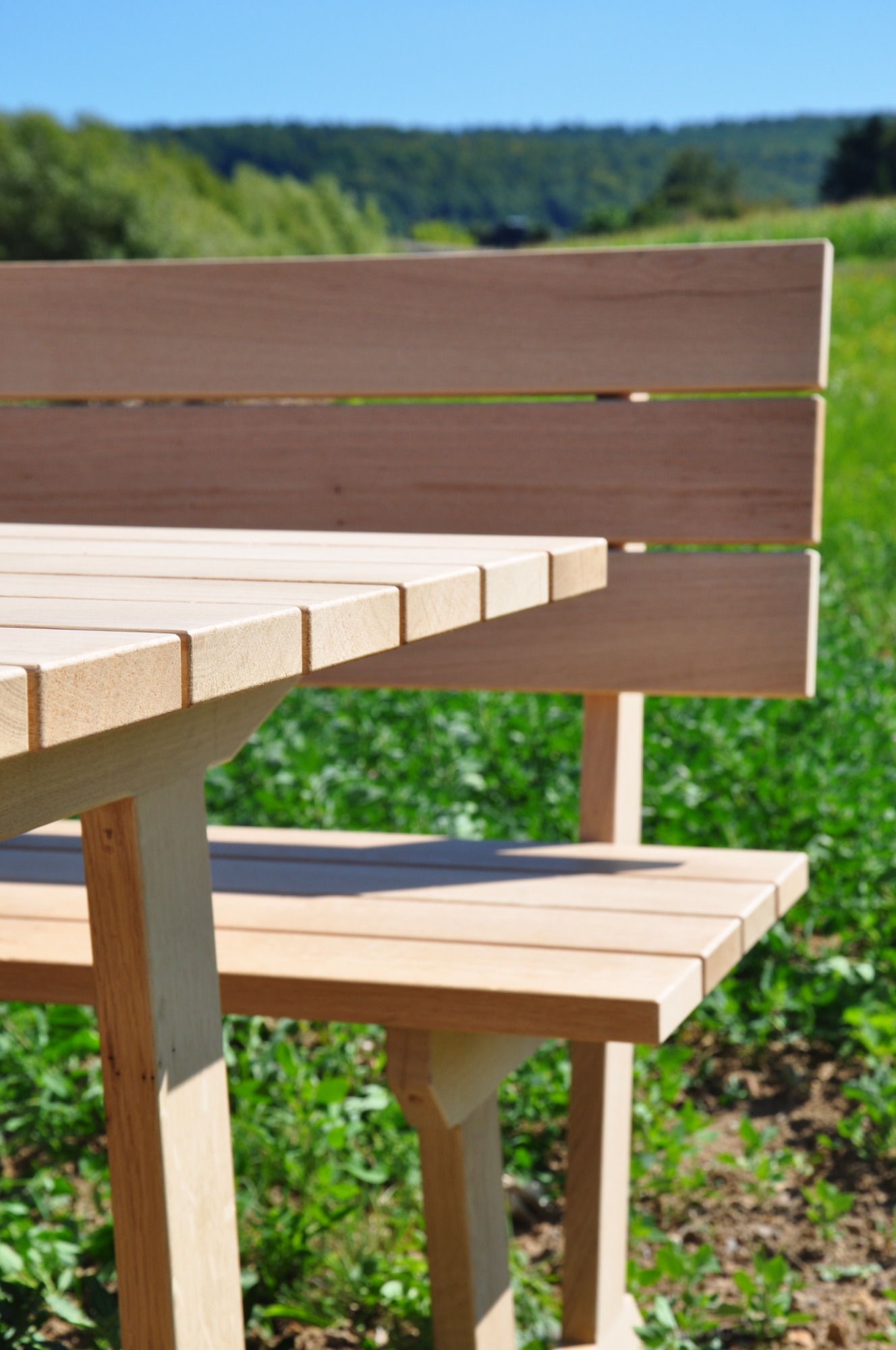 Gesellig genießen - robuste Garnitur aus massivem Eichenholz, auch einzeln als Bank oder Tisch erhältlich.